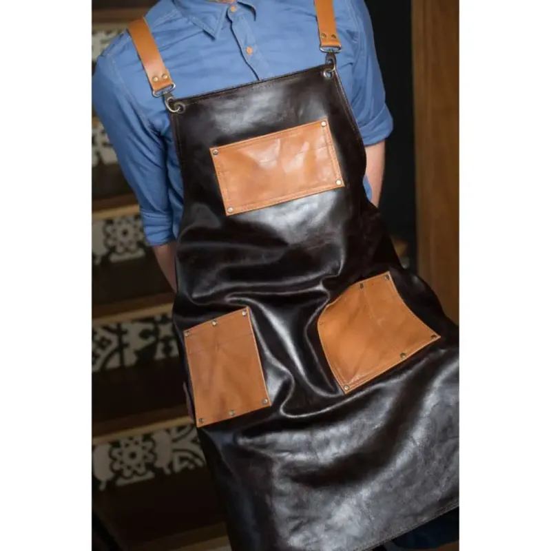 Grembiule professionale realizzato interamente in vera pelle di colore nero e tasche e tracolla di colore marrone. Creazione, disegno e realizzazione sono interamente prodotte in laboratorio. Design unico realizzato con materiali di alta qualità, oltre alla cura e all'attenzione per ogni dettaglio e rifinitura.