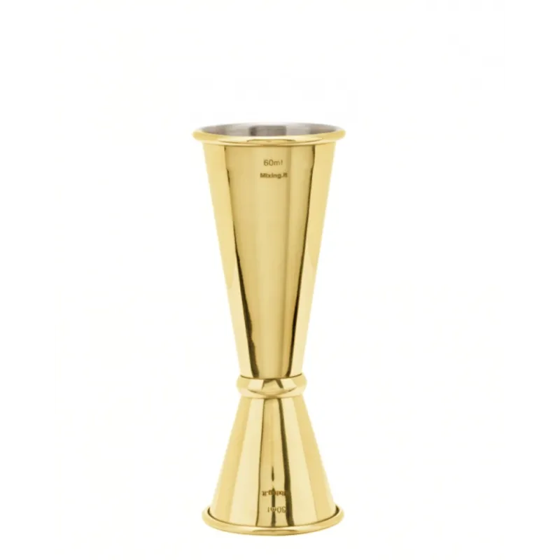 Jigger in stile japanese, del marchio Mixing - Professional Barware, realizzato interamente in acciaio inox e verniciato color oro. I jigger stile giapponese, a differenza dei classici misurini, presentano una forma conica molto stretta ed alta e ciò permette di controllare al meglio i flussi durante le versate. Pratico ed elegante.