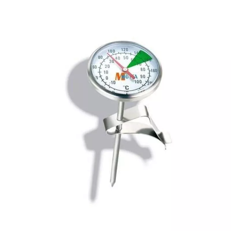 Termometro per il latte professionale. Ideale per monitorare la temperatura durante le fasi montatura del latte. Ci permette di raggiungere la corretta temperatura compresa tra i 60° ed i 70° che è sottolineata sul display del termometro con una fascia verde e che è indispensabile raggiungere per ottenere una buona schiuma. Dotato di una comodo sostegno che lo tiene agganciato alla lattiera durante le fasi di montatura del latte.